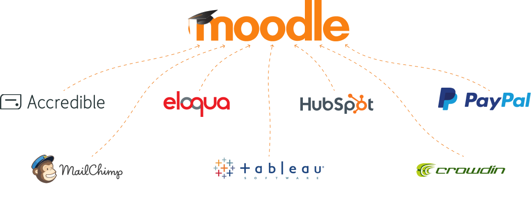We integrate Moodle with apps such as Accredible, Eloqua, Hubspot, PayPal, Tableau, MailChimp, Crowdin & many more!